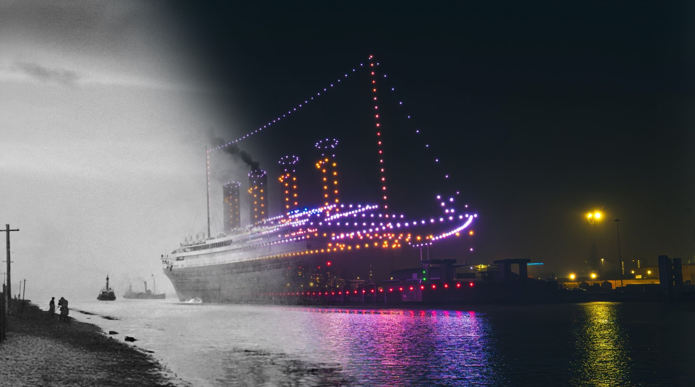 - Escala “Titanic”: Los drones no solo dibujaron el barco, sino que recrearon sus chimeneas, sus cubiertas y su icónica proa a una escala que permitía verlo desde kilómetros a la redonda.